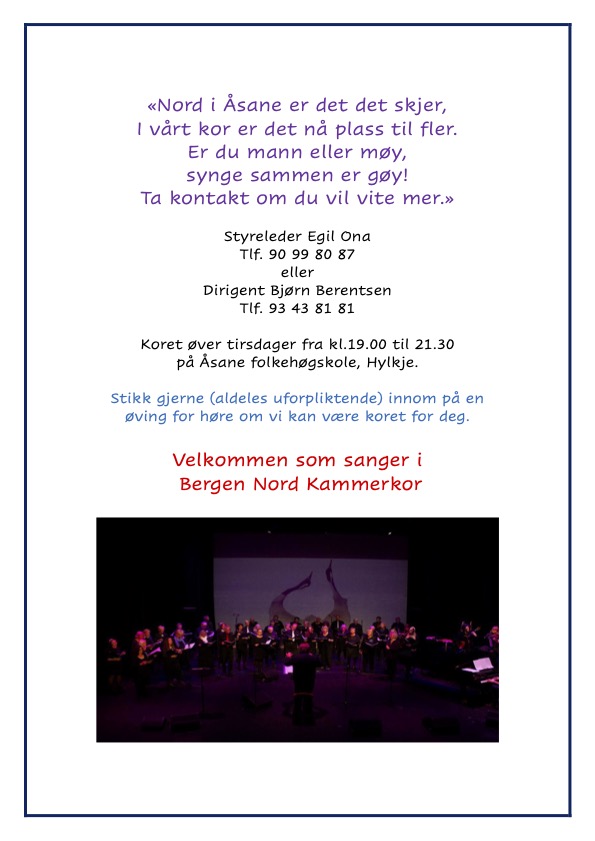 Koret øver hver tirsdag kl 19:00 til 21:30 i Åsane Folkehøgskole.